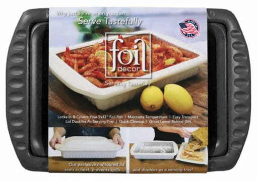 It is convenient for family gatherings, holidays, special events and tailgating parties where hot or cold food is served. When it is time to go, simply remove the foil pan from the Foil Decor system, leaving the leftovers with your host or hostess. Then simply take your Foil Decor home to use another day, or leave it as a gift.